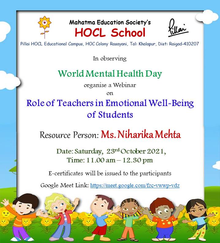 Both physical and mental well-being are indispensable for human survival in today’s contemporary arena. Its role is even more crucial during any unforeseen circumstances. Covid-19 pandemic is one such threat to humanity which has completely shattered the world. The catastrophic threat that the mankind is facing at present has adversely affected both the physiological and psychological state of mind. In order to address this issue and suggest various remedial measures, HOCL School in observing World Mental Health Day, organized a webinar on the topic “Role of Teachers in Emotional Well-Being of Students” on 23rd October, 2021.The Programme Coordinators for the webinar were Ms. Angel Sunder and Ms. Rashmi Solanki.